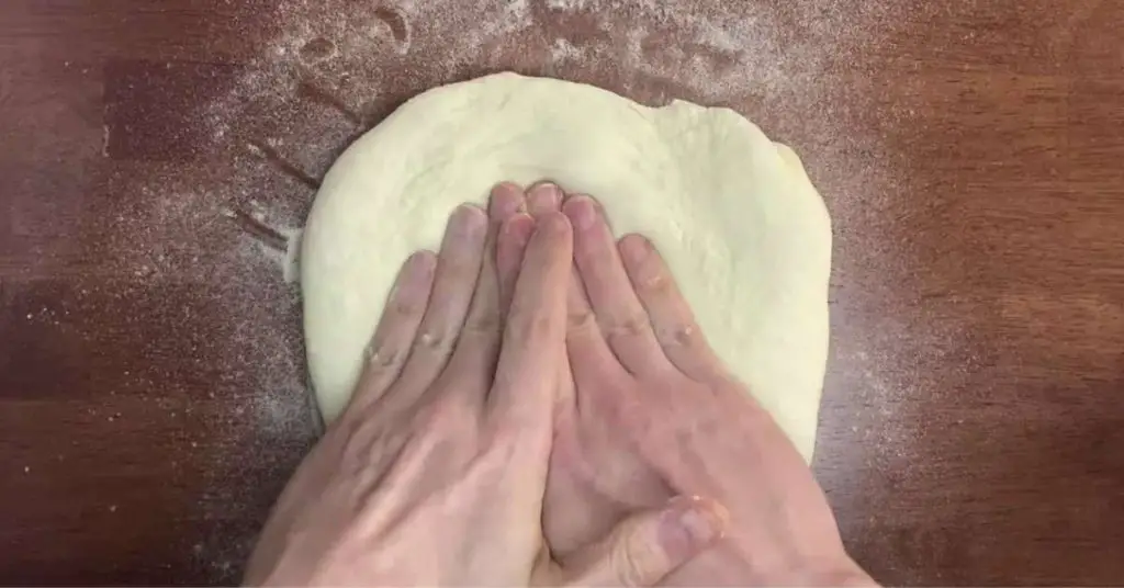 - Shape the dough: I recommend doing this by hand, but you can use a rolling pin as well. To do it by hand, start by pressing the dough ball in the middle and gently push the air into the outer edges. This will only work if the dough ball is relaxed and has been fully proofed.
